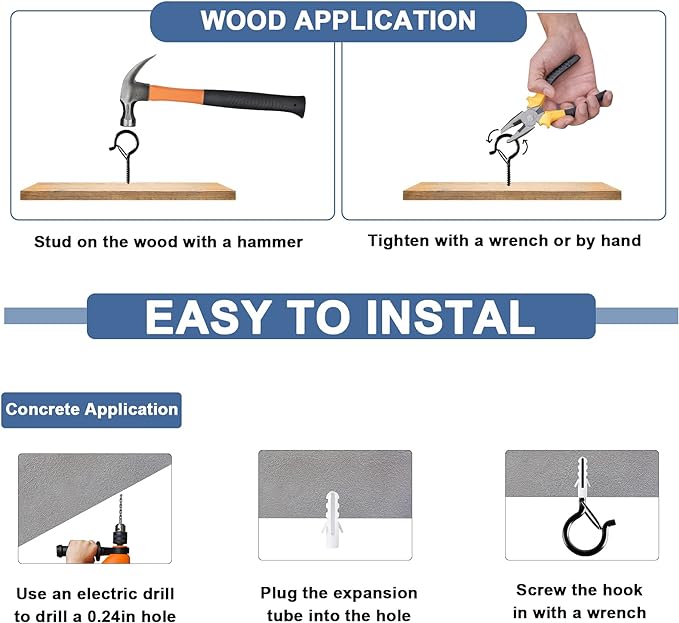 - Easy to Install & Use: String light hooks are easy to install. You can screw the hooks into the wood by hand or with a wrench, or use an electric drill to drill a 0.24in hole in the concrete wall, plug the expansion tube into it, finally use a wrench to screw the hook in. Great for patio, roof, deck, ceiling, porch, balcony, tree, fence, and more.